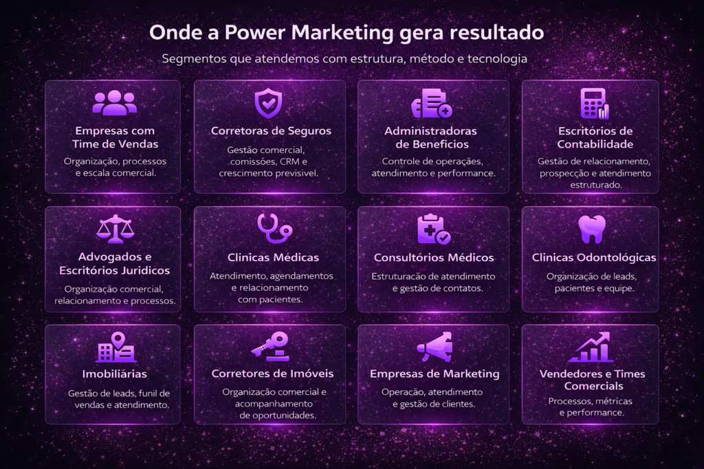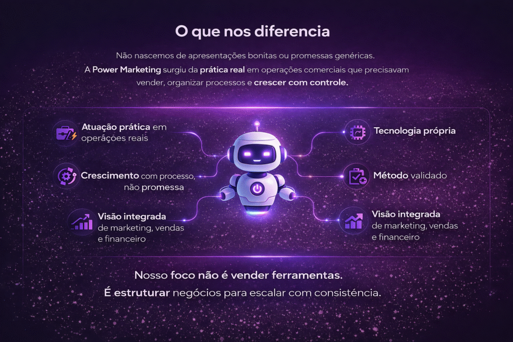 Crescimento sustentável exige estrutura: tecnologia, IA, estratégia, marketing e capacitação do time. A Power Marketing integra tudo isso em um único ecossistema.